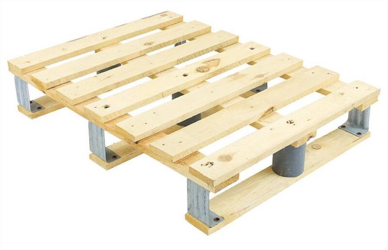 Palet de madera de exposición. Este palet es muy resistente gracias a sus apoyos metálicos y plásticos que le otorgan una capacidad de carga de hasta 1000 kg. Muy utilizado para la exportación y el transporte de bebidas